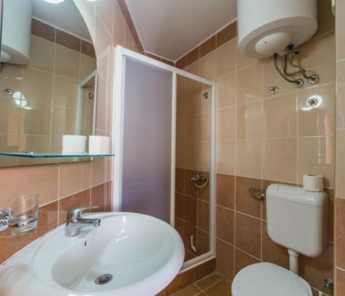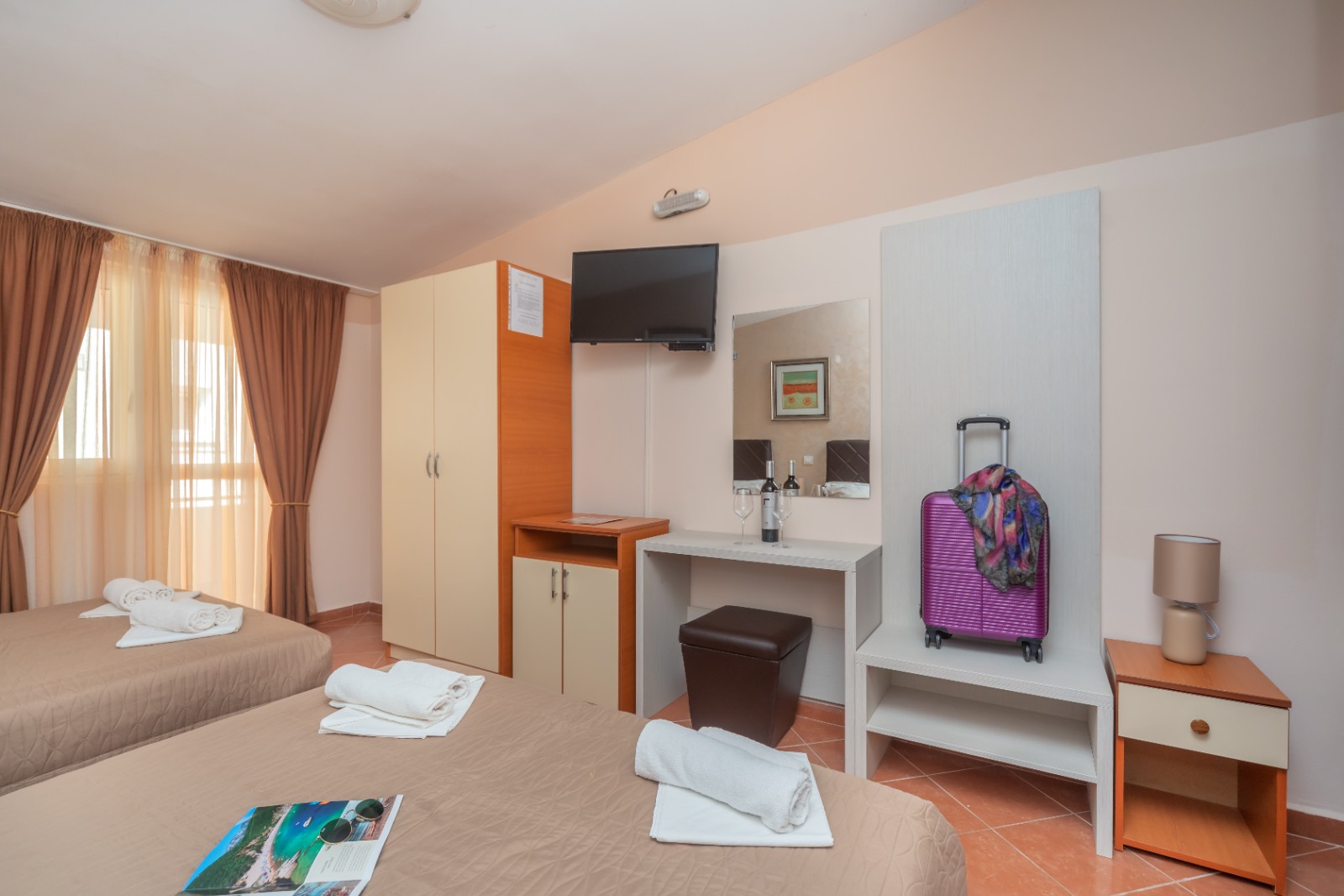 Usluga: PP- Polupansion, ( doručak/večera – izbor više jela po principu ankete-danas za sutra) Smeštaj: Dvokrevetni, trokrevetni i četvorokrevetni studio. Svaki studio ima kupatilo sa tušem, SAT TV, mini kuhinju sa kompletnom opremom, frižider, balkon i klimu a većina je sa pogledom na more.