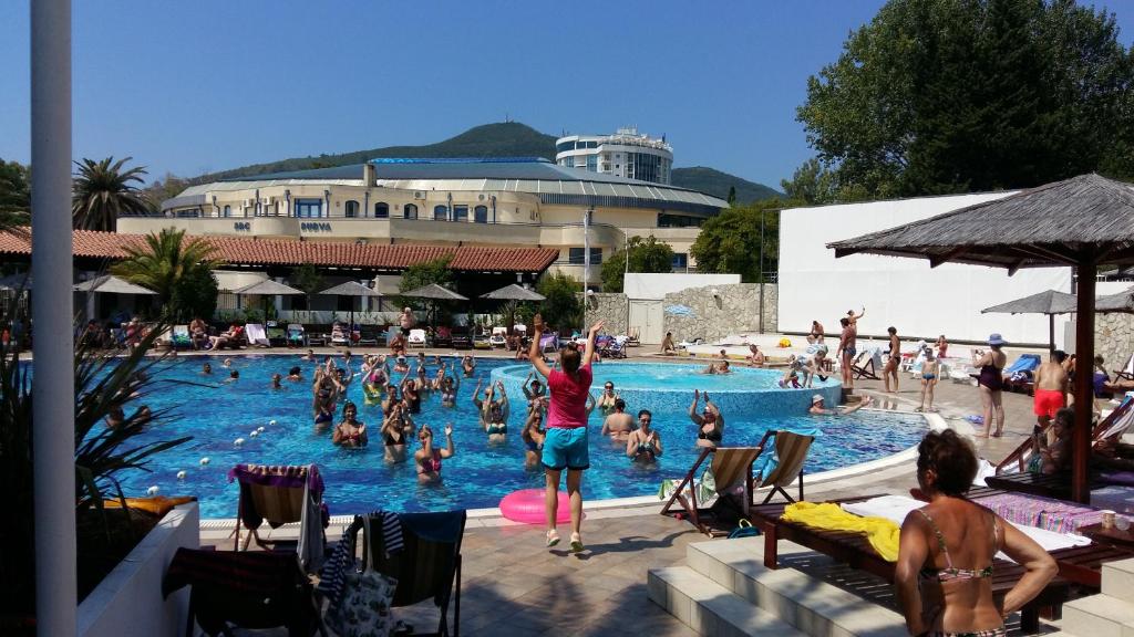 Sadržaj: Naselje se sastoji od recepcije, restorana, caffe barova, aperitiv barova, samoposluge, wellness i spa, teniskog i golf terene, igraonice i bazena za decu, Rondo bazen sa morskom vodom i bioskopom od 15/06-15/09, wireless internet gratis na javnim mestima (recepcija, loby, restoran Pjaca), parking koji se plaća.